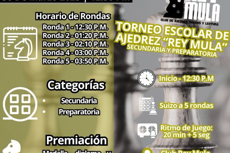 Mar182025 Eventos Torneo escolar de Ajedrez EventosBy victormarzo 18, 2025 Torneo escolar de Ajedrez secundaria y preparatoria Read more